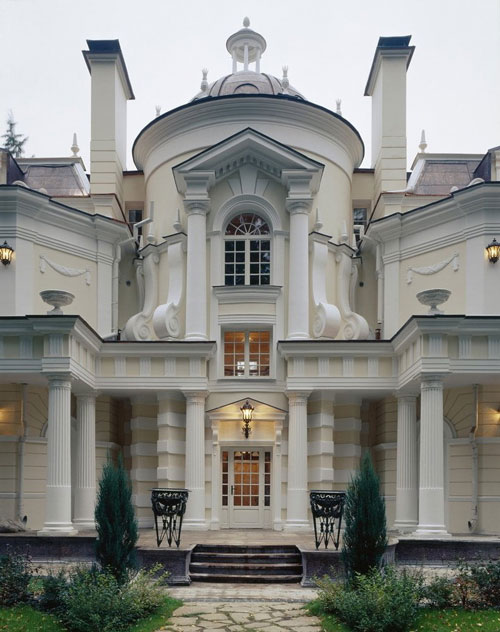 Фасадный декор в стиле ампир придает зданию величественный и спокойный вид, ненавязчиво подчеркивая статус хозяина дома. Современные технологии позволяют декорировать фасад вашего дома в стиле ампир без особых трудностей с использованием элементов лепного декора. Сохраняя такие достоинства декора из традиционного декоративного камня, как привлекательный внешний вид, прочность и долговечность, он обладает и рядом преимуществ: декоративный камень, изготовленный по специальной технологии, обладает низким водопоглощением, негорюч и экологически чист.
